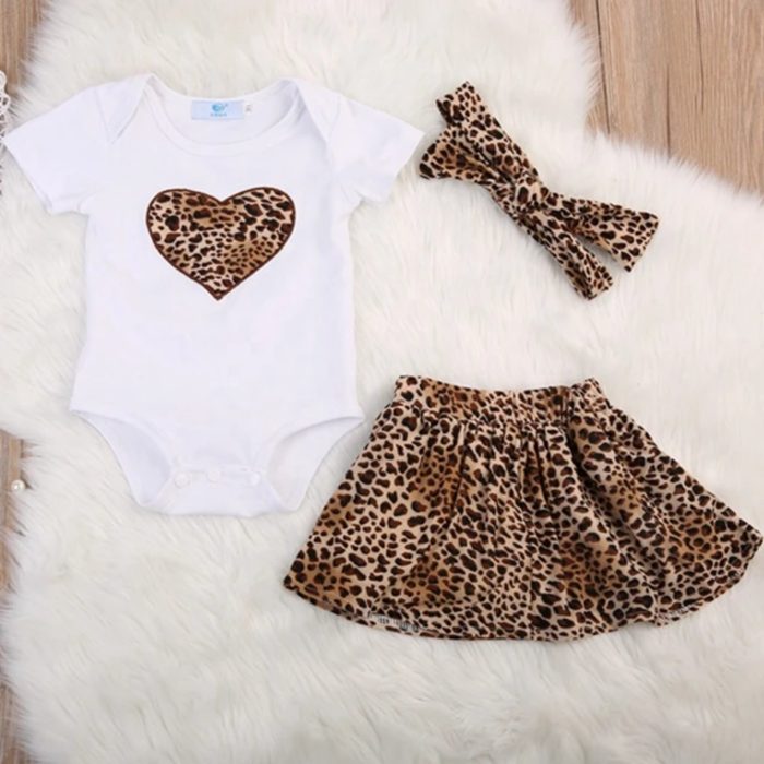 Animal Print Set , ολόσωμο λευκό με λεοπάρ καρδούλα συνδυασμένο με λεοπάρ φουστίτσα με λάστιχο στην μέση + ασορτί λεοπάρ κορδέλα
