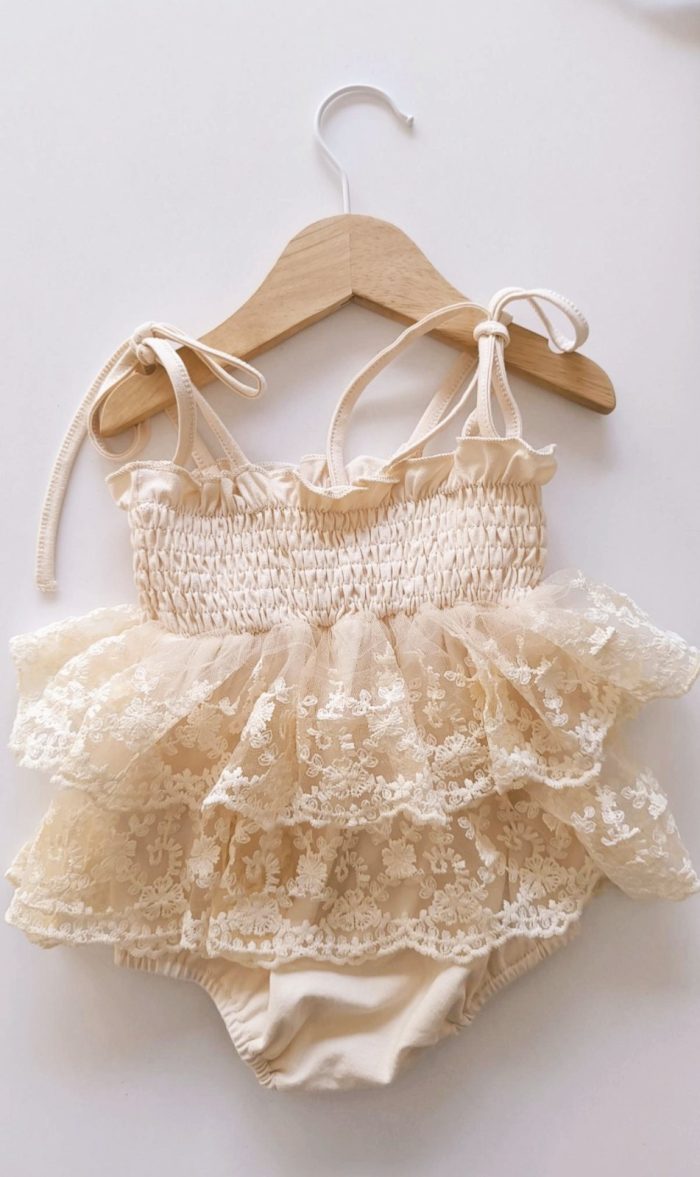 Super χαριτωμένο Romper με σφιγκοφωλιά στο στήθος για καλύτερη εφαρμογή πολύ μαλακό και άνετο , δέσιμο στους ώμους για αυξομείωση μεγέθους στο υπέροχο χρώμα της άμμου συνδυασμένο με δαντέλα .
