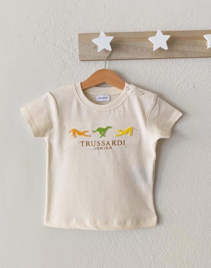 Βρεφικό T-Shirt στο χρώμα του βουτύρου με τρισδiάστα μοτίβο και κέντημα της εταιρείας Trussardi